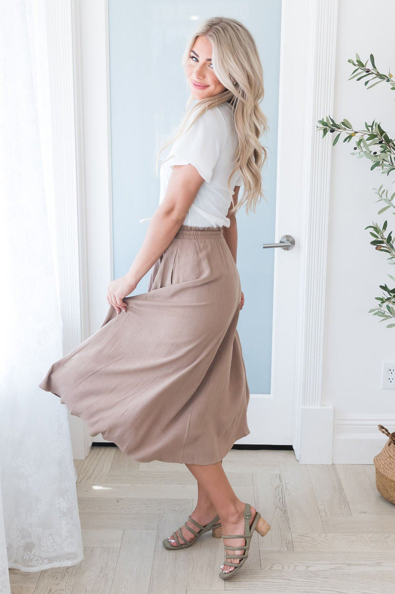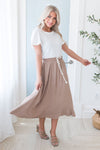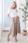 Say hello to this new gorgeous skirt! Our new Sweet Simplicity skirt has some amazing features, such as the lovely peanut brown color, string tied elastic waist, pockets, comfy casual material, and the perfect modest length! We can't get enough of this beautiful skirt, make sure to get yours today!