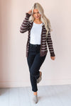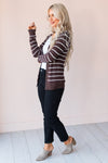 Our Sweet Stripes Cardigan is so darling! This cardigan has the most amazing features, such as the super soft knit fabric, long sleeves, beautiful gold buttons, and a beautiful chocolate color with ivory stripes! This sweater is perfect for any fall outfit, make sure to get yours soon!