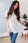 This delicate floral pattern and tiered bodice creates a feminine and and elegant fit! We love the ruffle detailing on the sleeves and curved neckline is absolutely radiant! The faded mint color and rose floral is oh so pretty!
