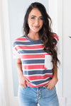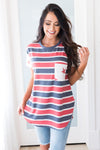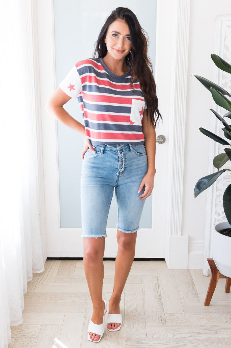 The Sweetest Surprise has just arrived! This lovely top features a modest round neckline, stars pattern short sleeves & cute stars pocket detail and a perfectly soft striped material throughout. This one is surely a must have!