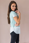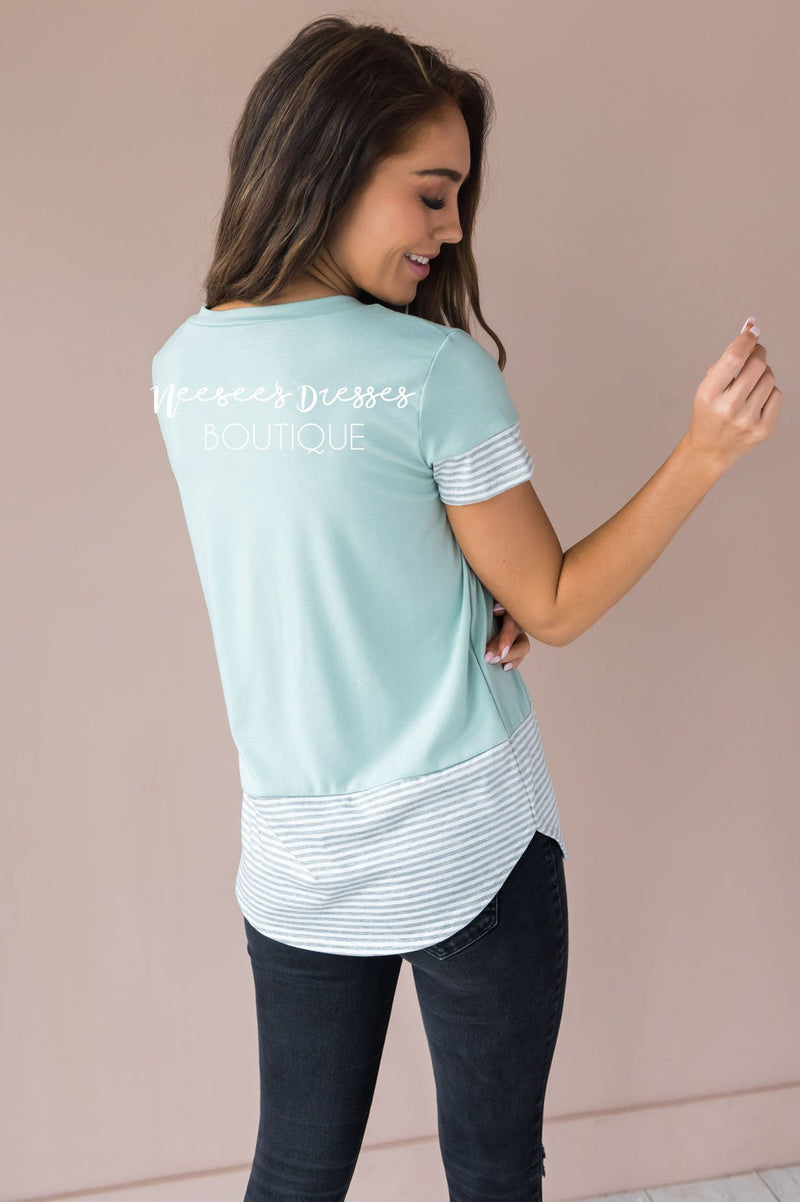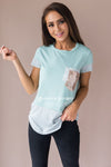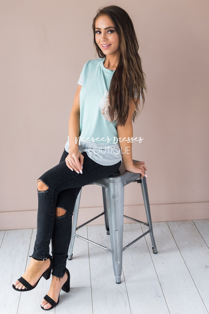 This super soft and cozy tee, is perfect for all year, especially those days you need to add a little sparkle to! Featuring mint body with ivory/grey striped detailing with the most adorable gold sparkle pocket for flair! Hurry, these will go quick!