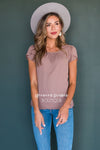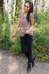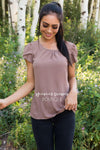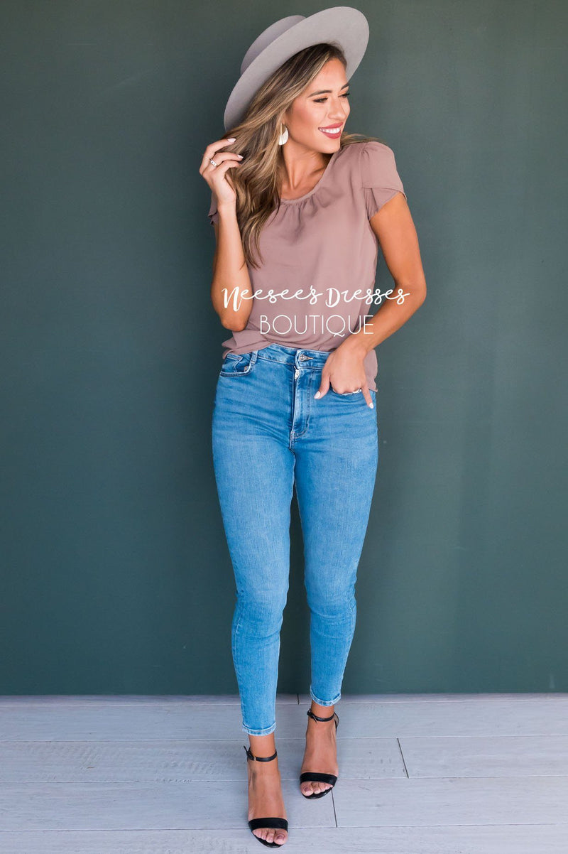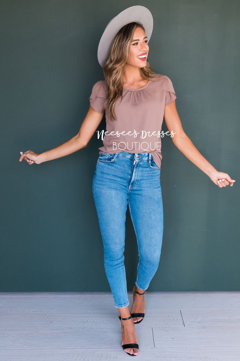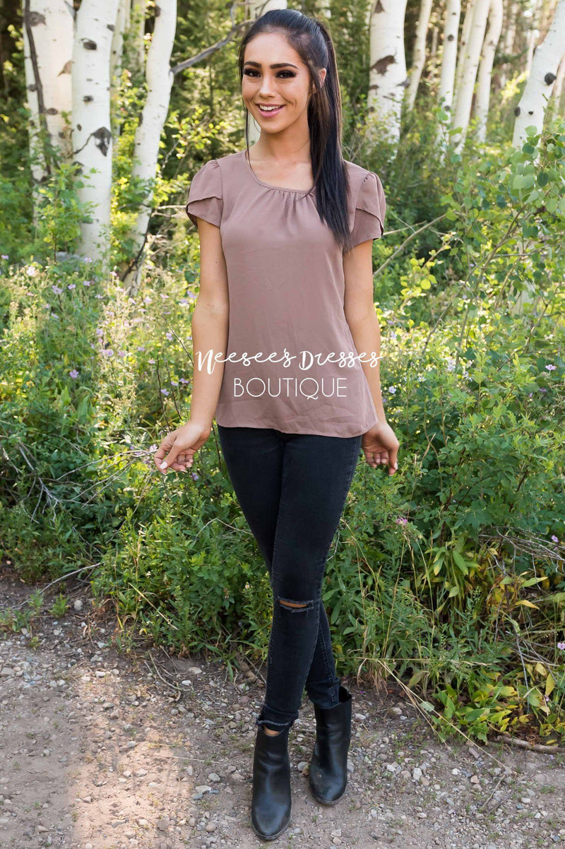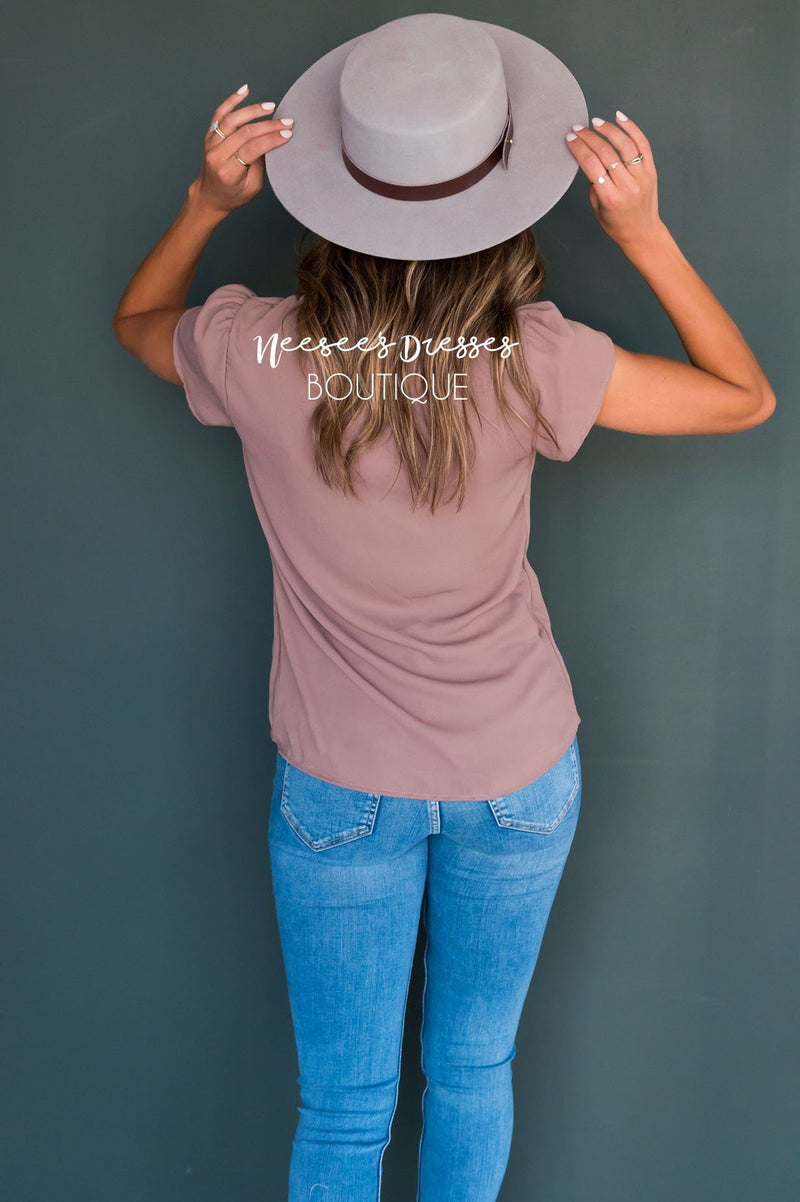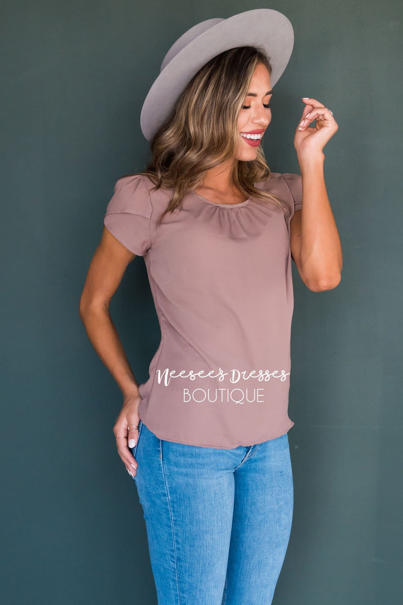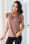 The perfect, go-to blouse! This beautiful taupe chiffon top features a gathered neckline and cute tulip sleeves. Perfect for pairing with all of your skirts!