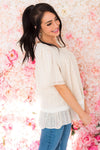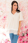 This gorgeous blouse will bring a little feminine touch to any outfit! If you've been on the search for the perfect spring blouse to add to your wardrobe, look no further! Features include lovely sheer waffle embroider overlay, short flutter sleeves and our favorite babydoll fit!