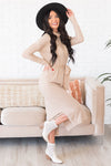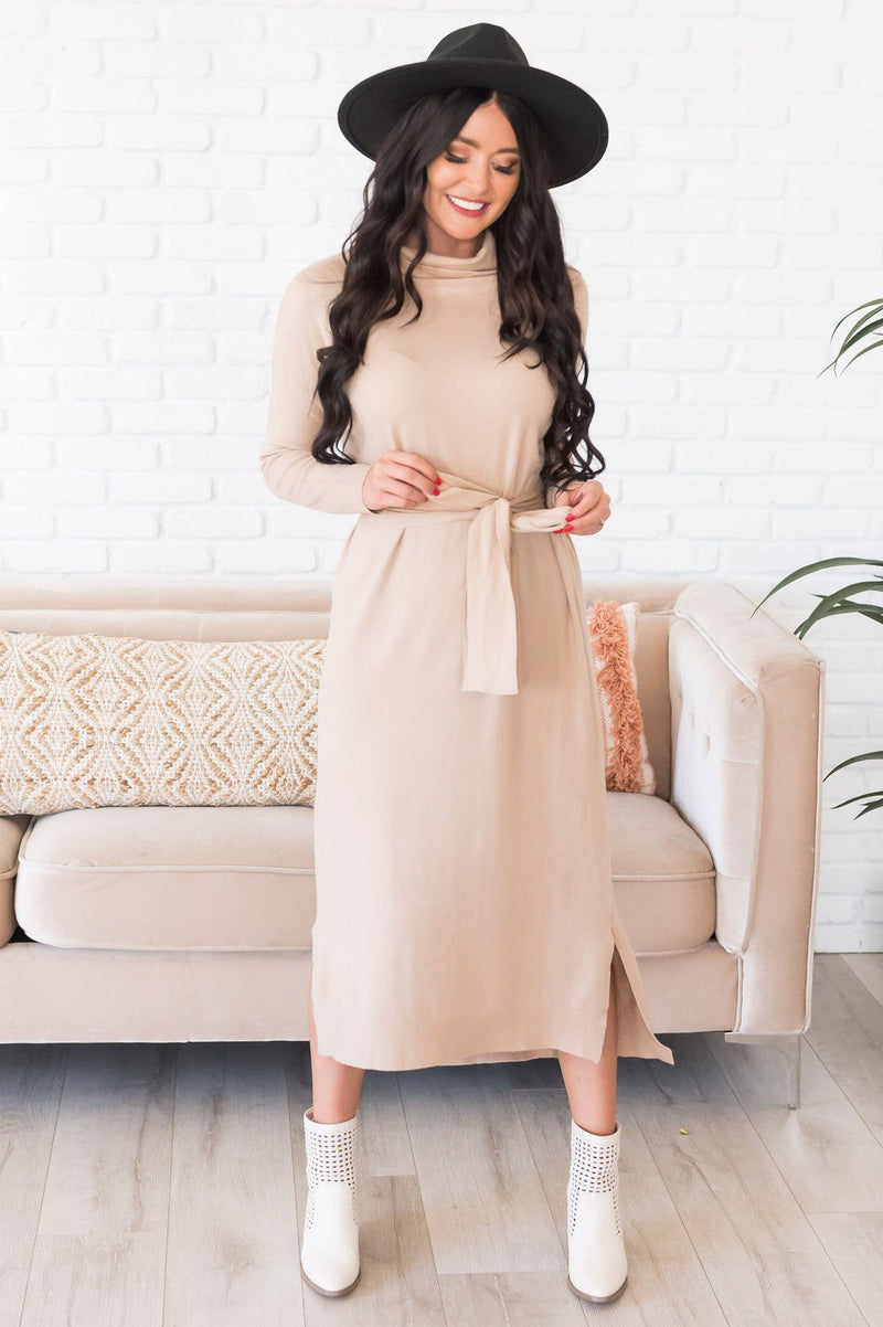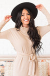 The Abbie is the most gorgeous sweater dress we've ever seen! Featuring a gorgeous light latte color, super soft sweater material, long sleeves, hi-low skirt, and the cutest cowl- turtleneck! Make sure to get yours soon!