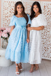 The gorgeous little Abigayle is bound to steal your heart! The lovely smocked bodice with swiss dot fabric is so eye catching and classy! This dress is perfect for Summer! Featuring short puff sleeves, belt tie waistline, and perfect length tiered skirt. Get this elegant beauty today!