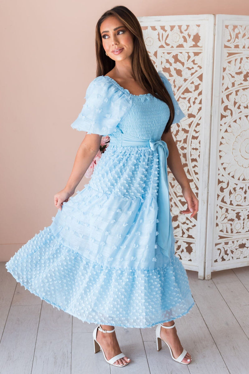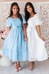 The gorgeous little Abigayle is bound to steal your heart! The lovely smocked bodice with swiss dot fabric is so eye catching and classy! This dress is perfect for Summer! Featuring short puff sleeves, belt tie waistline, and perfect length tiered skirt. Get this elegant beauty today!