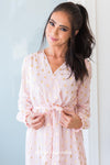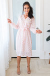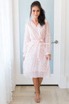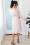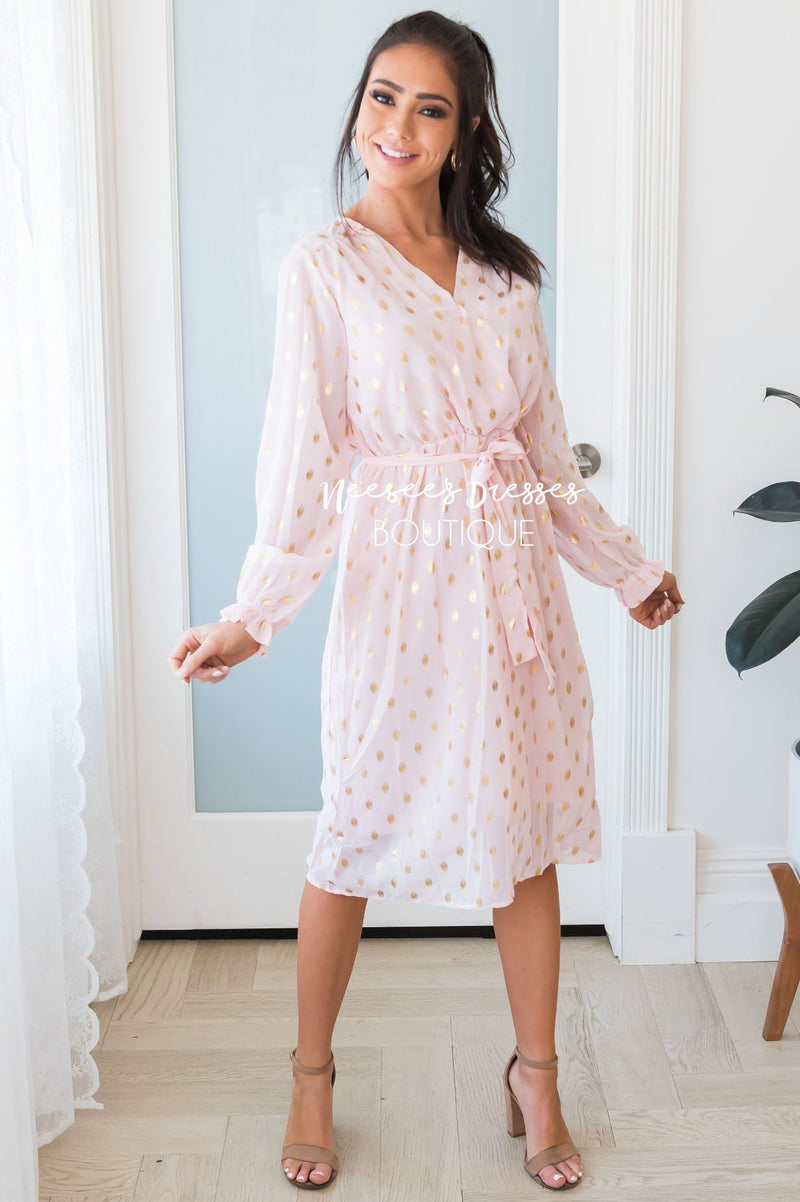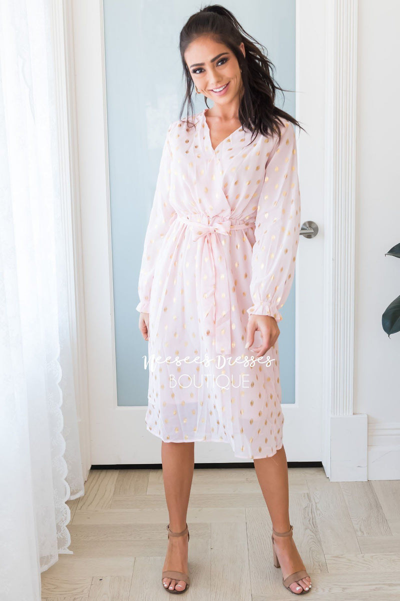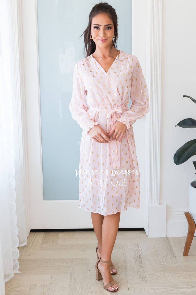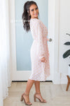 This darling sheer diamond shimmer dress is one to steal the show! It is so gorgeous and classy! We are loving the cross over bodice, long sleeves, belt tie waist and perfect tea length!