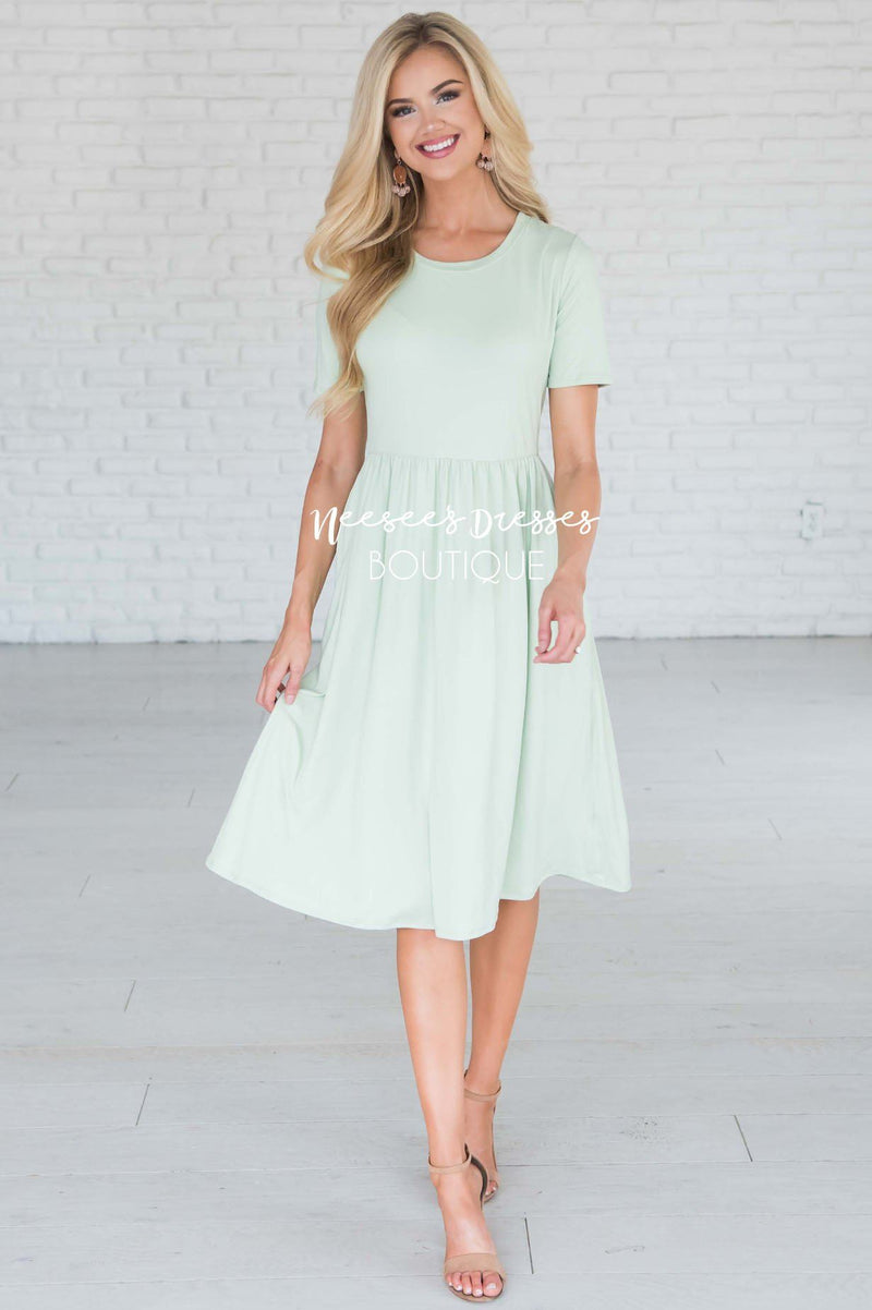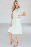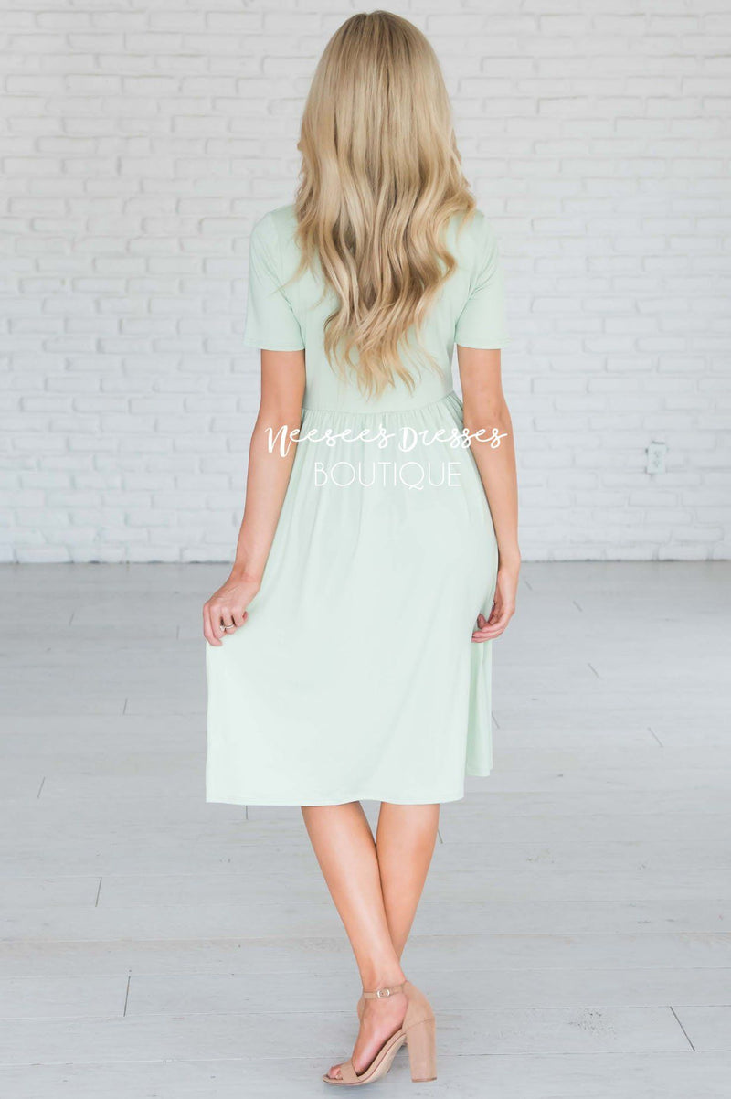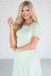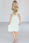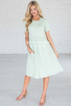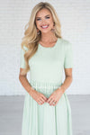 The perfect dress just arrived and we cannot be more excited about it! This beautiful tea green dress features short sleeves, scoop neckline, an elastic waist and side pockets.