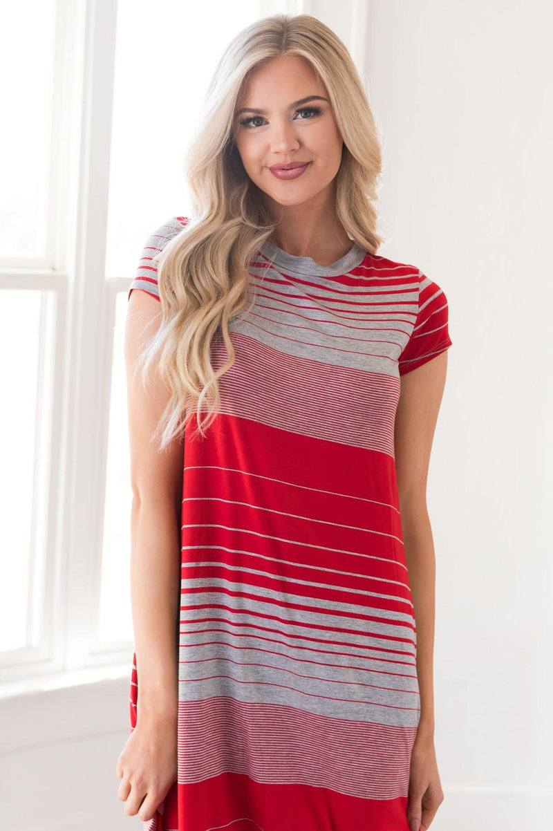The Adelia will effortlessly take you from season to season! This lightweight striped swing dress is perfect for layering with your favorite leggings and cardi or great flying solo! This modest beauty won't last long so click add to cart now!