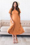 The Adelina is an absolute favorite from our summer collection! This beautiful ginger colored dress has so many stunning features, such as a V-neckline, an elastic waist, short flutter sleeves, and a smocked bodice! This dress is a must have!