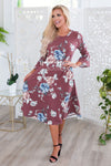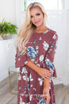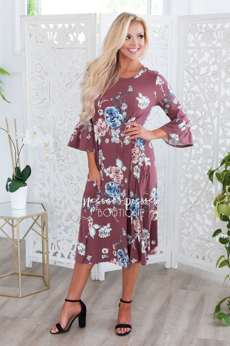 The Adelle is here to save the day, everyday! This dress is so soft and comfy you will want to wear it everyday to every occasion and you can! Beautiful dark mauve floral has a modest high neckline, pockets and half bell sleeves.