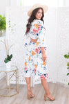 The Adelle is here to save the day, everyday! This dress is so soft and comfy you will want to wear it everyday to every occasion and you can! Beautiful ivory floral has a modest high neckline, pockets and half bell sleeves.