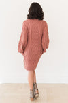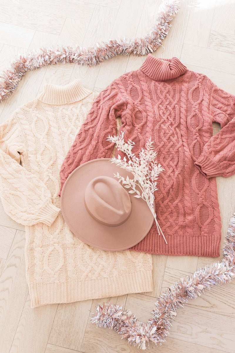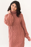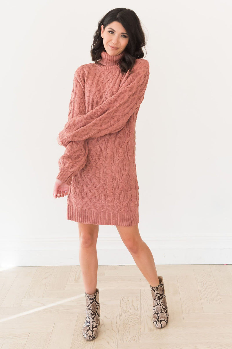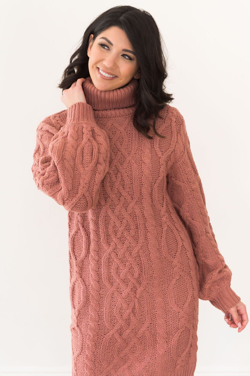 Our new Adrian sweater dress is so gorgeous! We adore the cowl turtleneck, the beautiful dark rose color, the cable knit detailing throughout, and the modest midi length! Dress this beauty up with stockings and accessories and you'll have the perfect winter outfit!