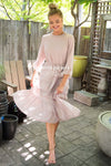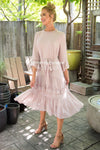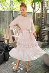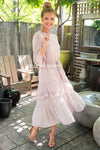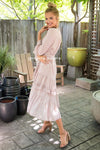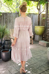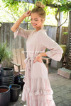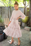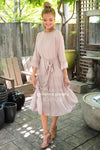 The New Afton is the idyllic dress for you! Soft and flowy tiered ruffle skirt, textured swiss dots throughout, fully lined, 3/4 length ruffle sleeves, belt tie and keyhole button closure. Truly the perfect dress for any outing and any occasion!
