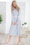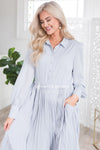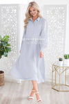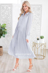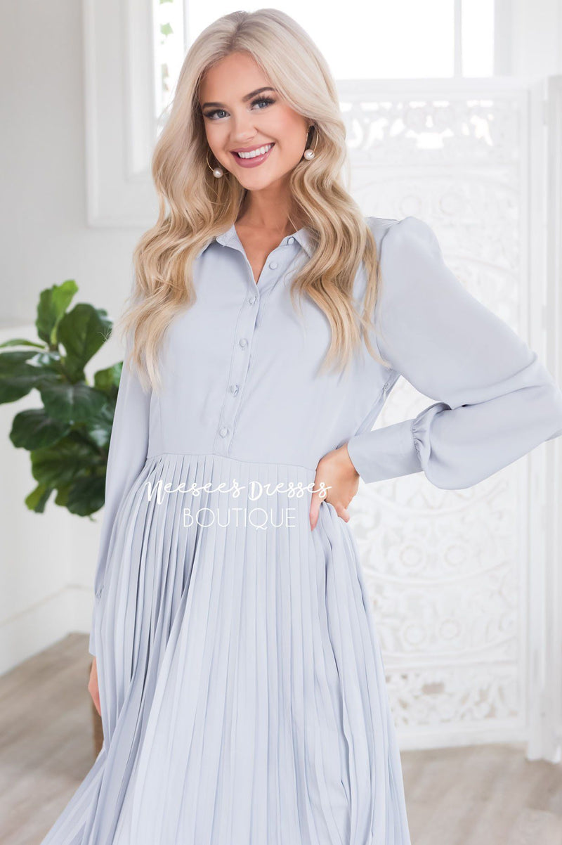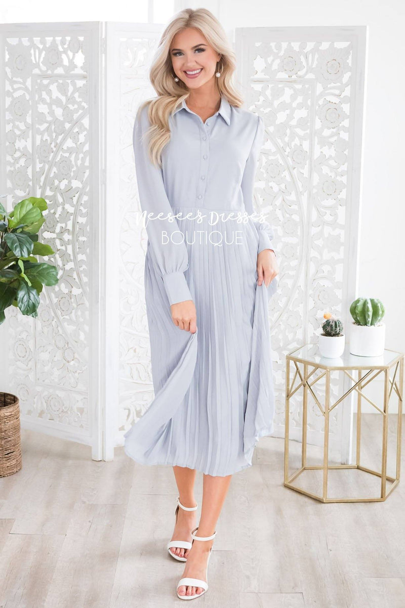 The Darleen is one of our new favorite modest dresses. Featuring a collared neckline, functional button bodice, long flowy cuffed sleeves, and a pleated skirt! This dress would be perfect for church, a bridal shower, and so much more! Make sure to purchase yours today!