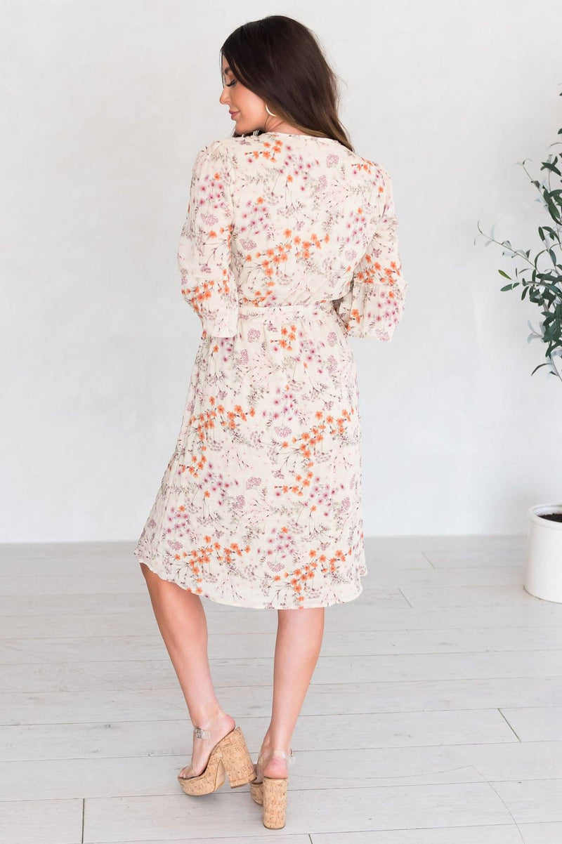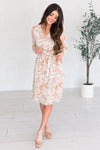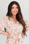 Say hello to this fall floral beauty! This beautiful beige dress has the most amazing features, such as half sleeves with a ruffled hem, an elastic waist with a belt tie, v-neckline, and dainty orange, sage, and lavender floral print throughout! We can't get enough of this new arrival, get yours before they're gone!