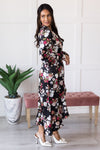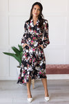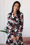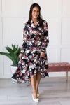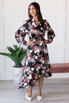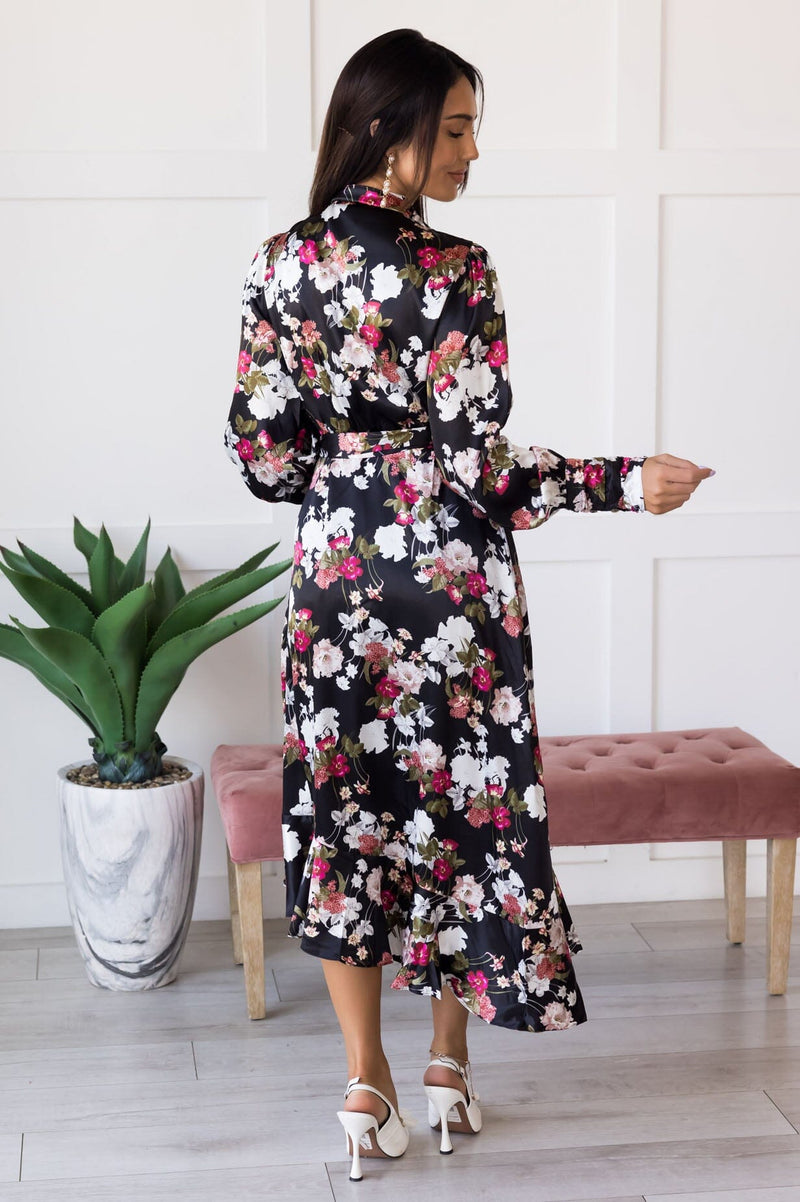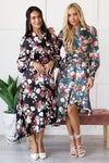 The Ailey is the dress dreams are made of! This lovely delicate floral wrap dress is the special occasion dress everyone needs! Featuring a gorgeous collared neckline, lovely long button cuffed sleeves, belt tie waistline and ruffled feminine high/low skirt. Get yours before they are gone!