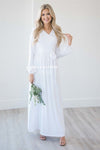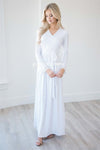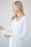 Simple yet so elegant! The Ainsley features a cross over front, a gathered waist with a side tie and long sleeves with a lace cuff!