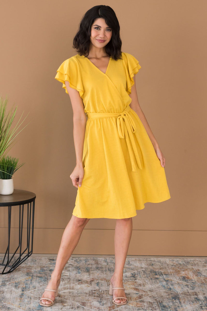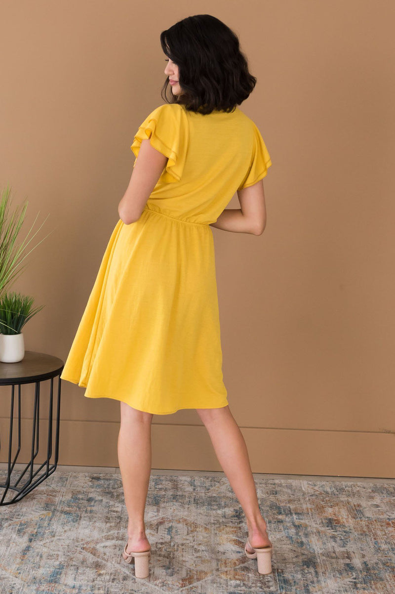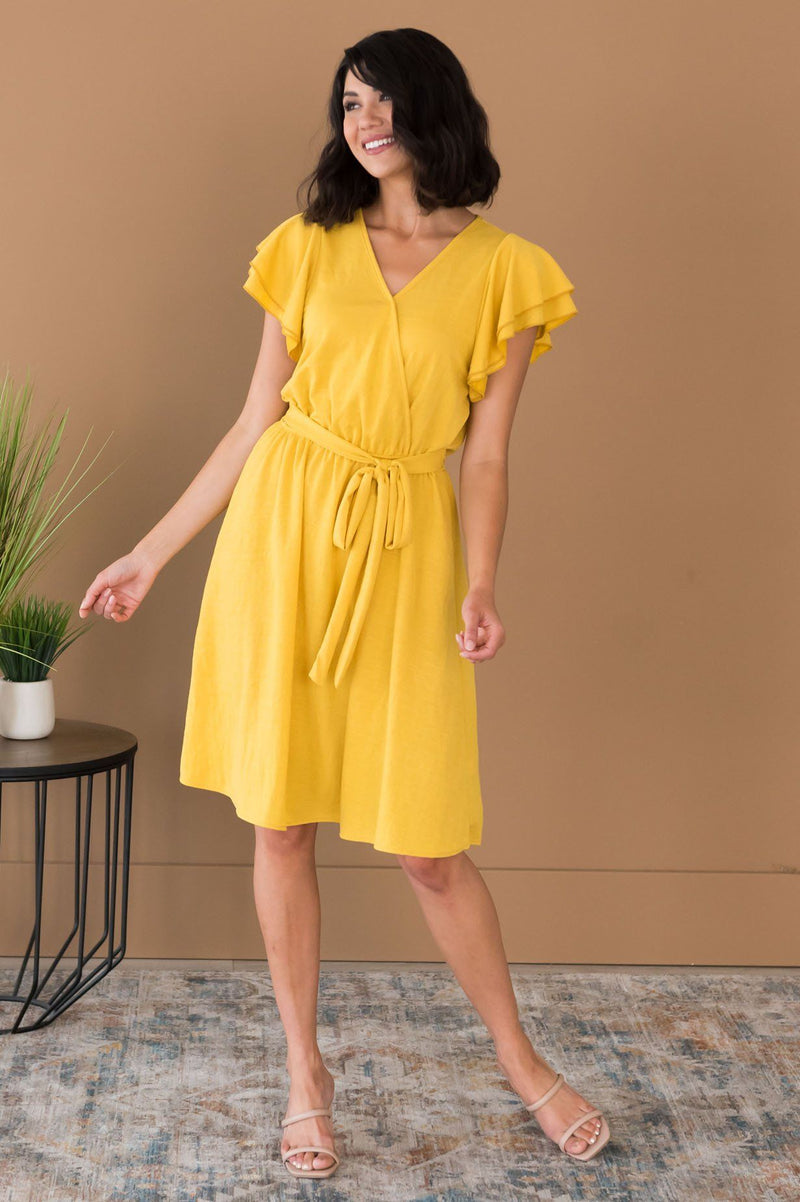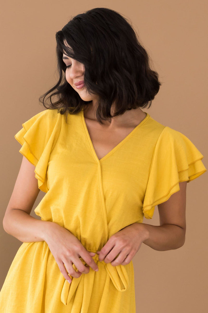 We can't get enough of this simple yet beautiful new arrival! The fabulous mustard color, V-neckline, short flutter sleeves, and the belt tied waist on this dress will have you in love! The cinched waist adds a functional and flattering design element as well! We know this fabulous dress is one you don't want to miss out on this summer!