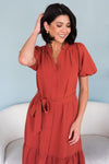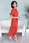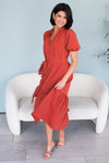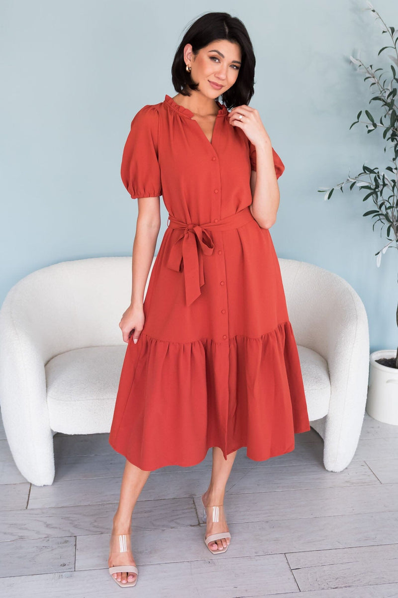 If you have been on search for the perfect Fall dress for all your upcoming special occasions, look no further! Our new, modest, Alaska Dress, is the one for you. Featuring a feminine ruffled soft v-neckline, beautiful bubble sleeves, functional button front with a belt tie waist and a flowy ruffled tea-length skirt.