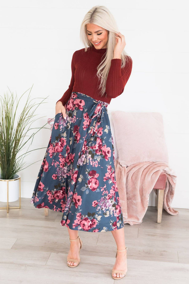 The Alba has stole our hearts! From the darling floral print skirt, to the belt tie waist and long sleeved ribbed bodice, we simply can not get enough! Get yours today before these beauties are gone for good!