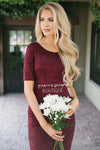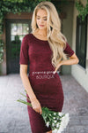 Who doesn't love an absolutely beautiful lace dress! This stunning wine lace dress is fully lined, features half sleeves and a round neckline. The romantic dress will not disappoint and is forever timeless! Belt and accessories not included