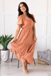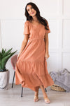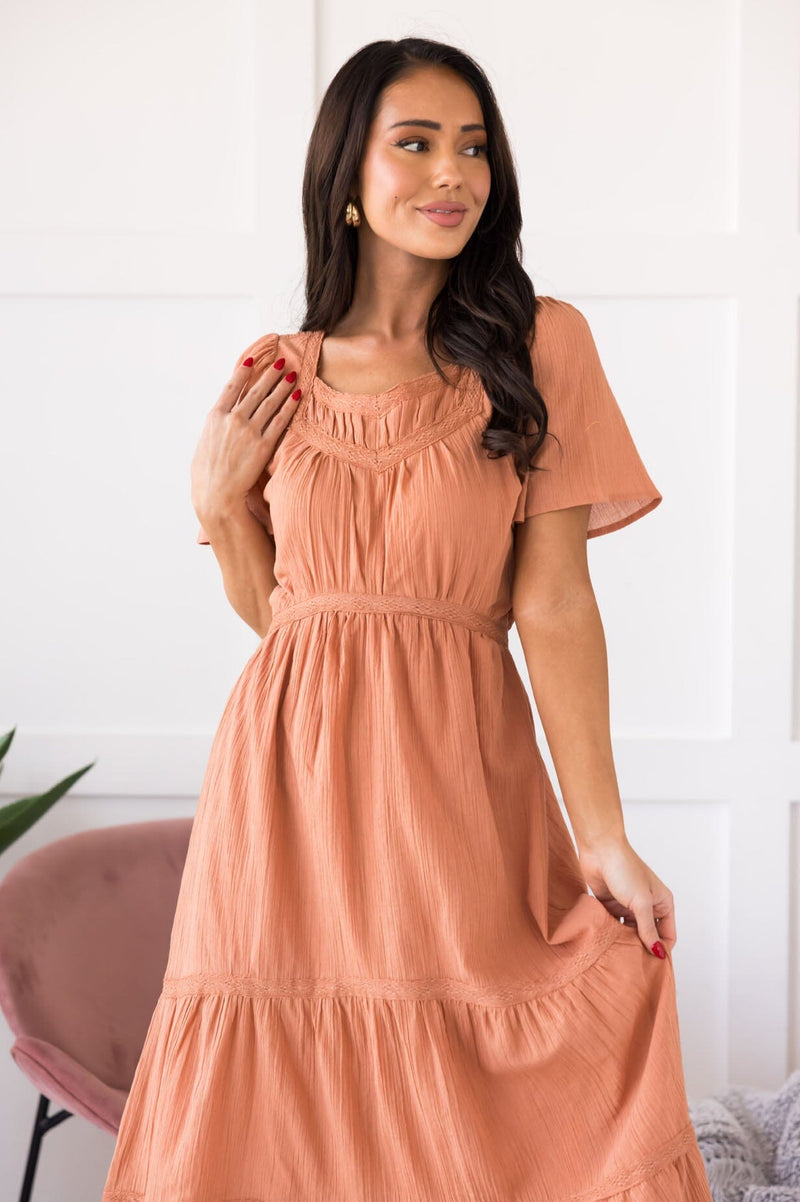 Wow! Welcome our gorgeous new Alexis Maxi Dress! This beautiful terracotta colored dress has so many stunning features, such as a modest round neckline, short flutter sleeves, a tiered hi-low skirt, and lace embroidery on the bodice and tiered skirt! This dress is a must have!