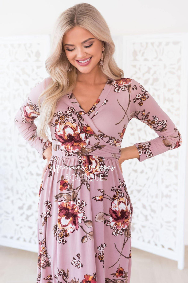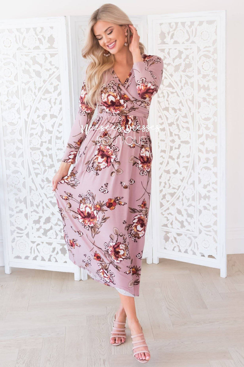 This modest beauty checks all the boxes! Soft, classy, perfect for any occasion! Get yourself the Aliana today! Lovely floral dress features as always, modest length in a gorgeous flowy skirt, cross-body bodice, elastic waist & long sleeves.