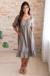 Kickstart your Fall wardrobe with the new Alice dress! We simply adore the delicate textured material, lovely sweetheart neckline with flattering and comfy smocked backing, pockets and ruffle hem skirt beyond measure! This is a true must have for everyone!