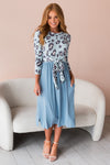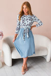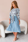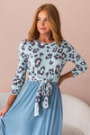 This darling Alycia dress has stolen it's way into our hearts! Lovely grey & mint leopard print fabric creates such a classy piece! Featuring a lovely bow tie detail at the waistline, 3/4 length fitted sleeves, elastic waist and a full flowy heather blush skirt. You are going to want this added to your wardrobe, trust us!