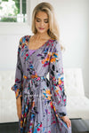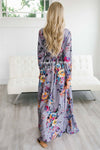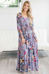 The Amanda is a must have this fall! This dress will leave you feeling beautiful for any occasion! This dusty lilac dress features a colorful floral print a cross over front, a self tie waist, long cuffed sleeves and a stunning full maxi skirt. Under shirt is sold separate.