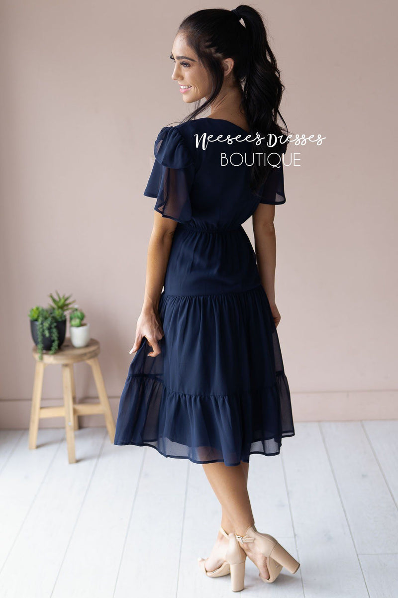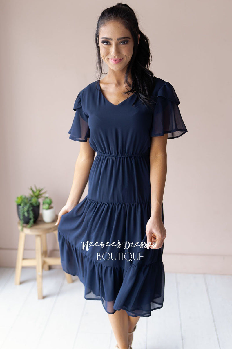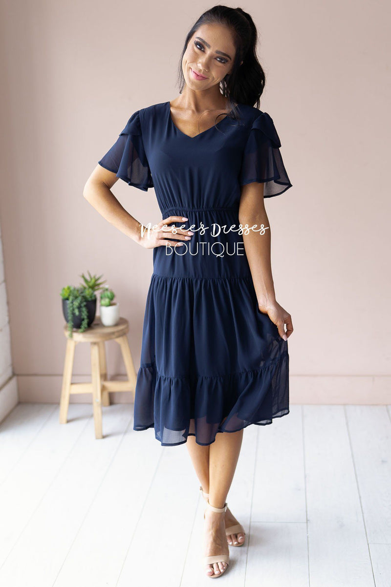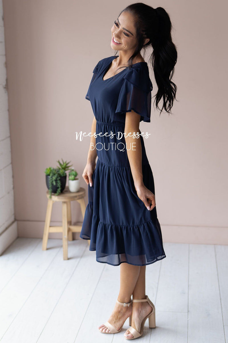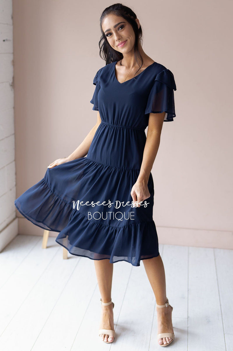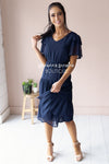 The Amara is the perfect feminine go to dress! So lovely with it's sheer flowy material, classy navy color, tiered short sleeves and perfect tea length skirt! You simply can not go wrong with this gorgeous dress! Get yours today!