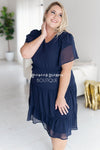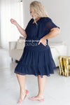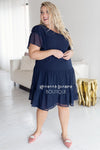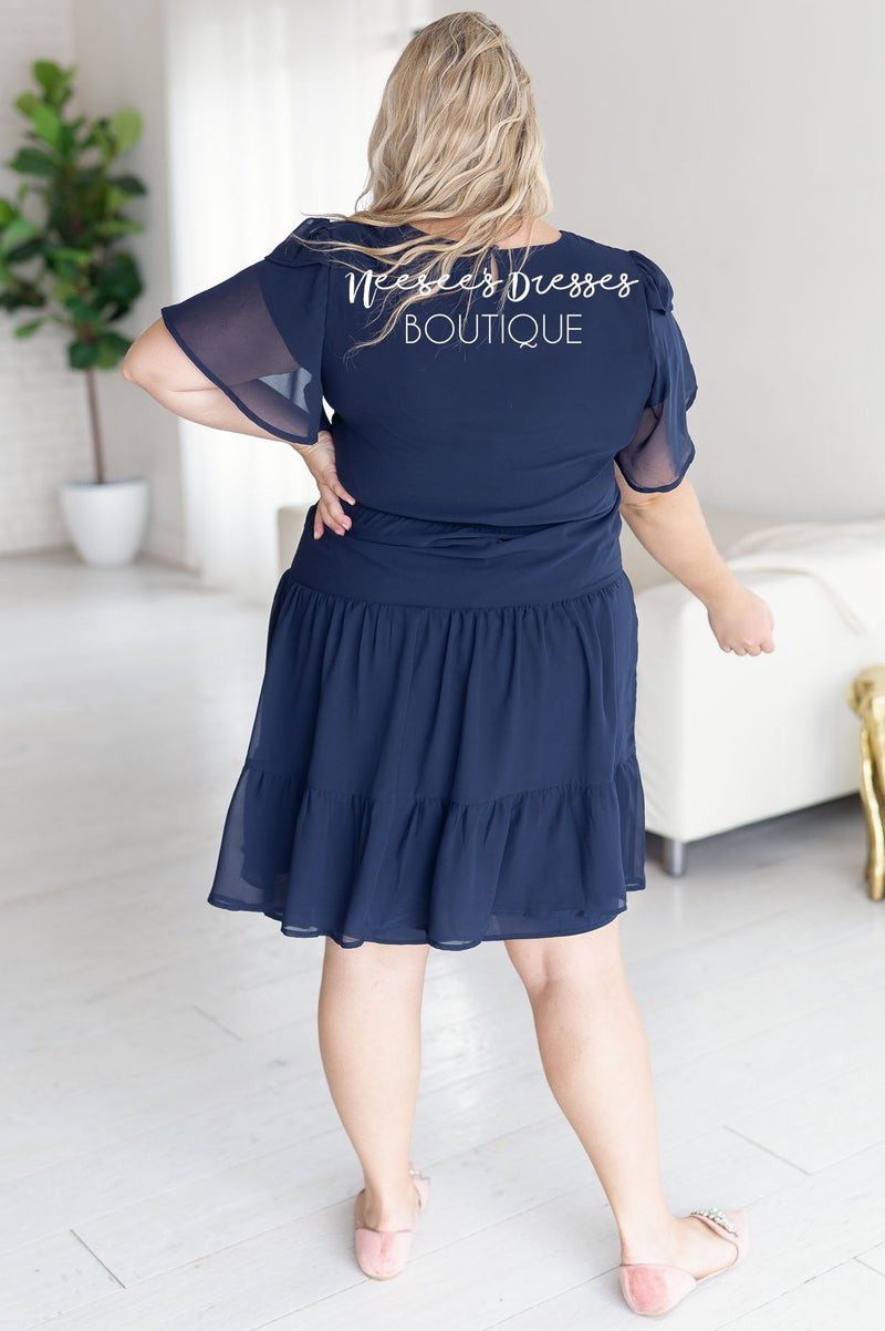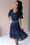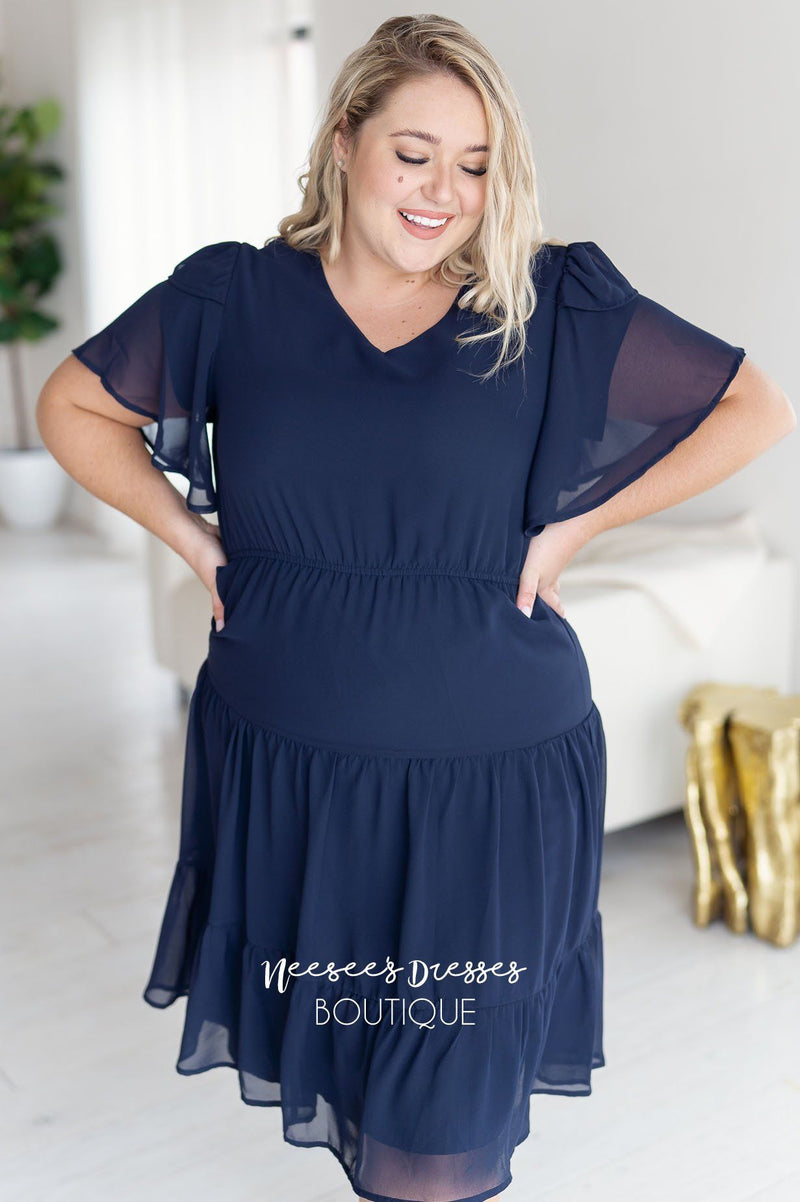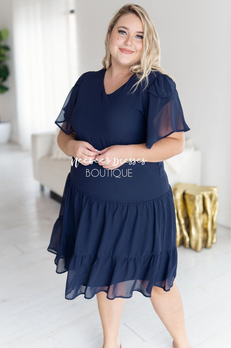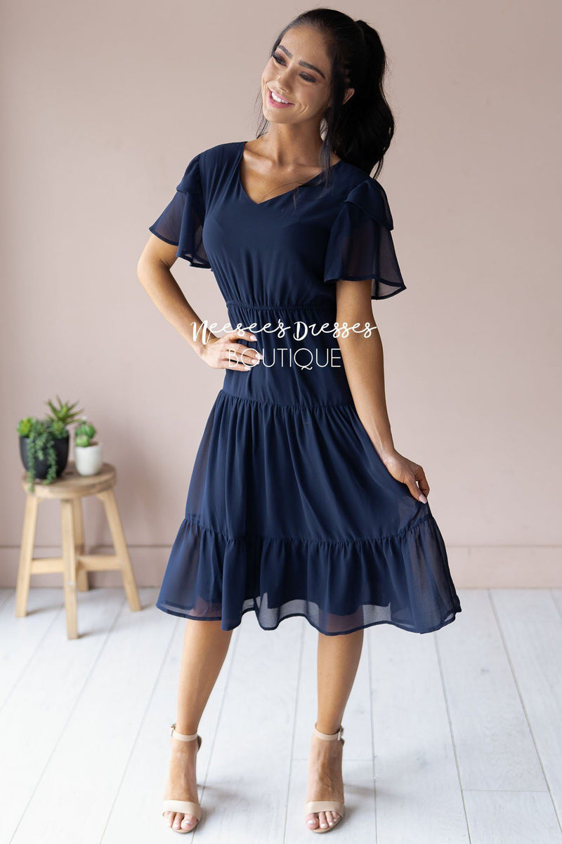 The Amara is the perfect feminine go to dress! So lovely with it's sheer flowy material, classy navy color, tiered short sleeves and perfect tea length skirt! You simply can not go wrong with this gorgeous dress! Get yours today!