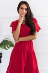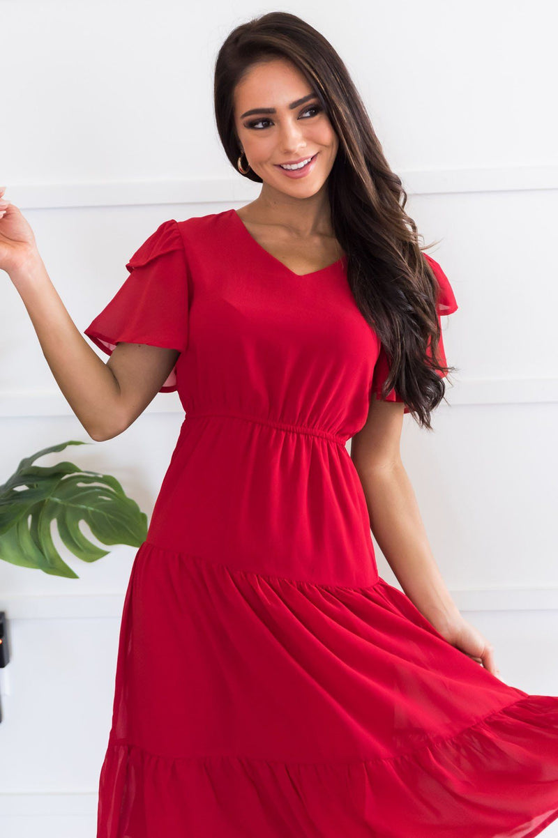 The Amara is the perfect feminine go to dress! So lovely with it's sheer flowy material, classy red color, tiered short sleeves and perfect tea length skirt! You simply can not go wrong with this gorgeous dress! Get yours today!