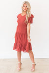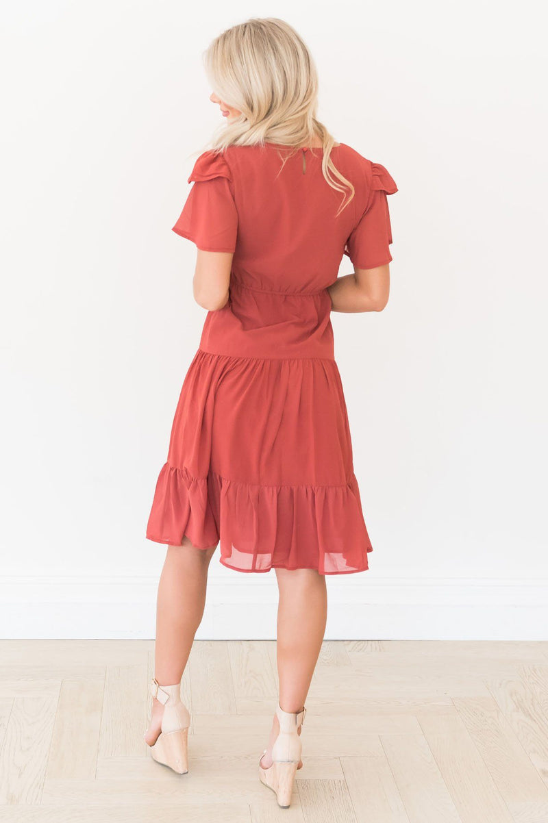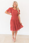 The Amara is the perfect everyday midi dress! This dress is so lovely, from its flowy material, beautiful brick red color, ruffled short flutter sleeves, and the perfect tiered tea length skirt! You simply can not go wrong with this gorgeous dress! Get yours today!