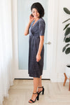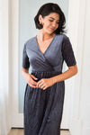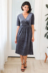 Our new Amberlea dress is so classy, timeless, and oh-so lovely! We have never seen such beauty! It features a modest cross over v-neckline, beautiful charcoal velour sparkle fabric, fitted half sleeves, and a high elastic waistline. This dress is sure to sell out, so hurry and gets yours today!