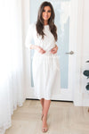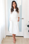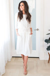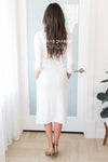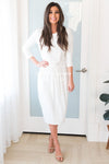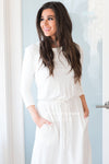 This gorgeous modest dress is so effortlessly cute! Featuring lightweight jersey material, 3/4 length sleeves, an elastic waist with a faux tie detail and side pockets. Truly a must have go to dress!