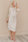 This gorgeous modest dress is so effortlessly stylish! Featuring lightweight ribbed jersey material, 3/4 length sleeves, an elastic waist with a faux tie detail and side pockets. Truly a must have go to dress!