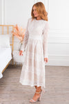 The darling Andrina has stolen the show! This lovely lace beauty is a must have for every wardrobe! The lace detailing throughout is simply to die for! Additional features include, modest round neckline, long lace sleeves, cuffed waistline and long flowy lace skirt. Get yours today!