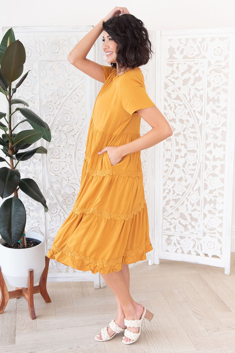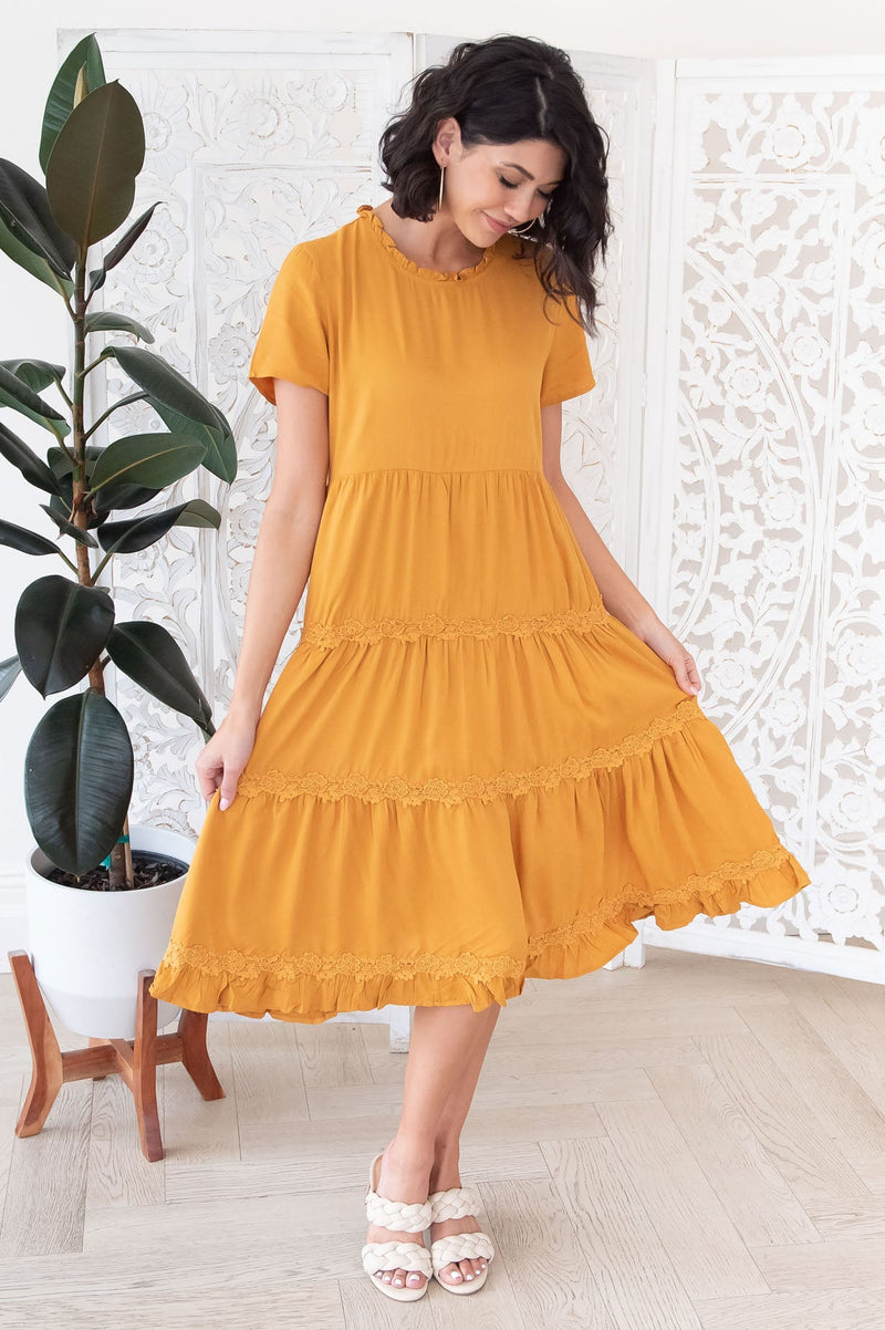 The most beautiful tiered dress has just arrived and this beauty has stolen our hearts! We are so in love with the delicate feminine crochet lace trimming on each tier of the skirt, the short sleeves & the lovely ruffled neckline! This dress is a true must have and will carry you from season to season with ease!