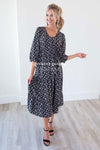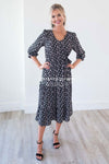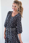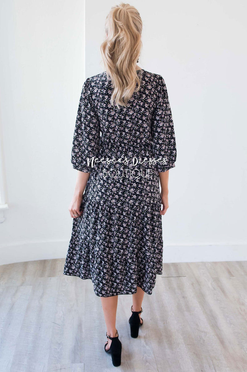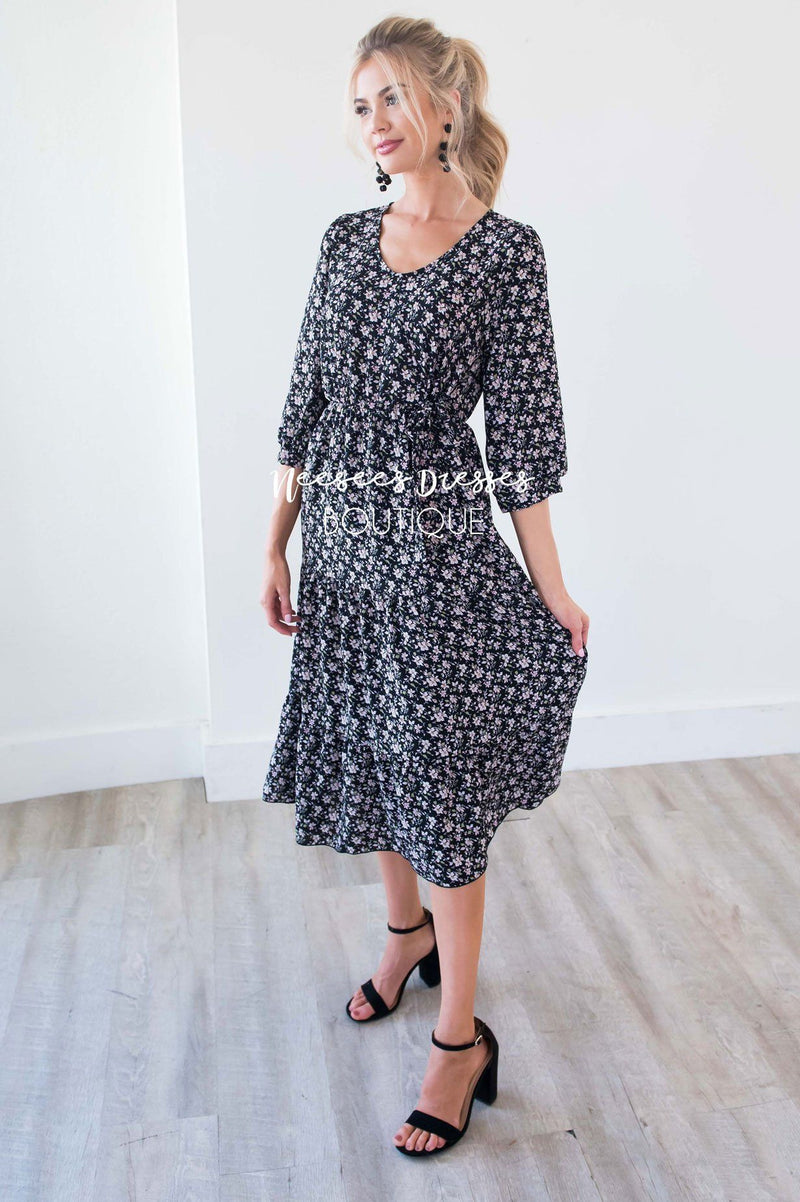 Gorgeous is an understatement! This dress is the perfect addition to your wardrobe. Beautiful black dress features a mini mauve floral print, 3/4 length sleeves, an elastic tie waist and pretty tiered skirt. Lined.