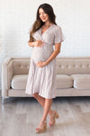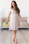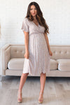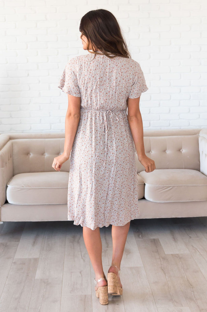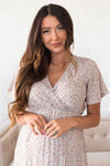 Allow us to introduce you to your new favorite dress, the Angelina! This dress is everything you could want in a midi dress and more! Featuring flowy short flutter sleeves, wrapped cross-over bodice, elastic belt-tied waist, nursing friendly bodice, pockets, and a flowy modest length skirt. Those amazing features along with the ivory, rust, and light blue floral print makes this one is must have for sure!