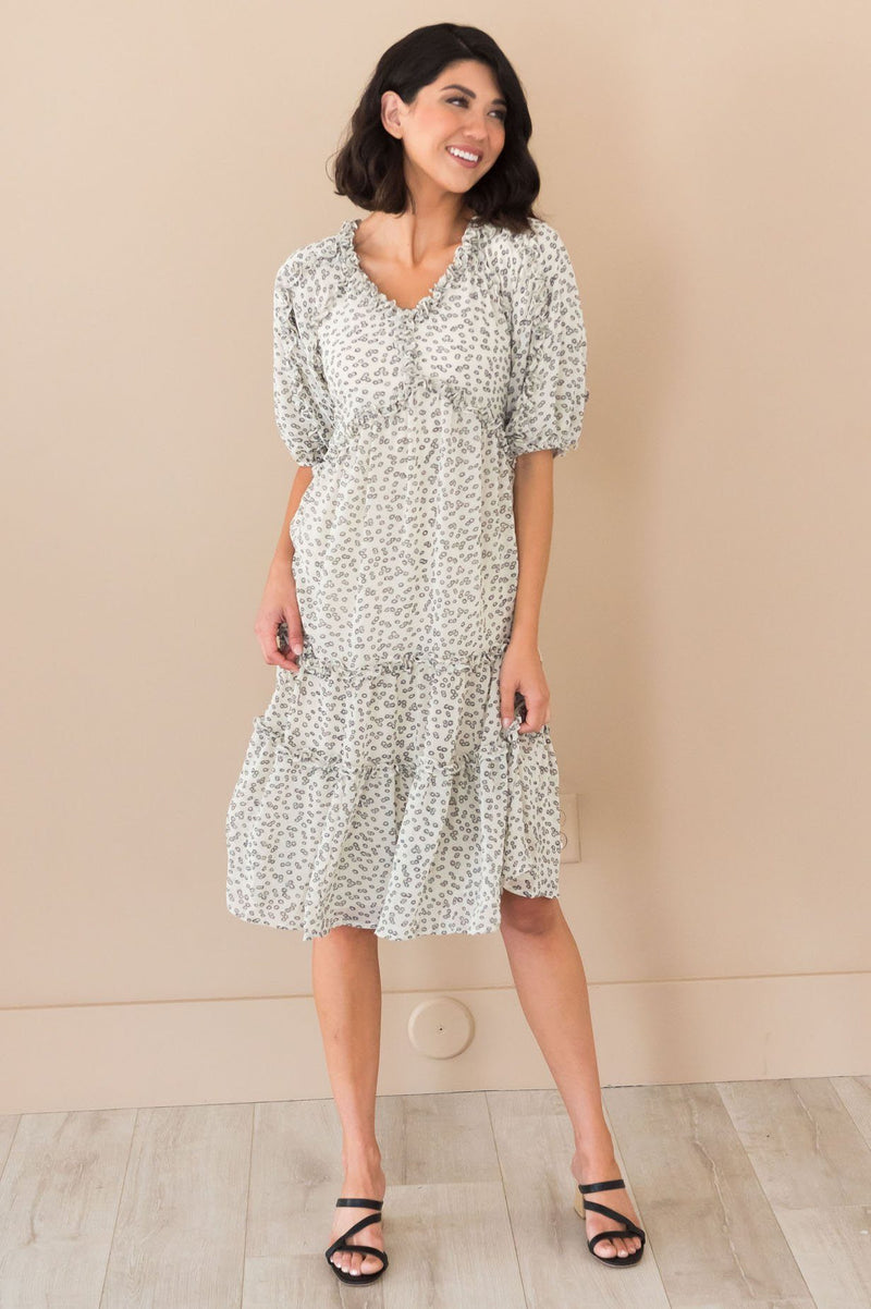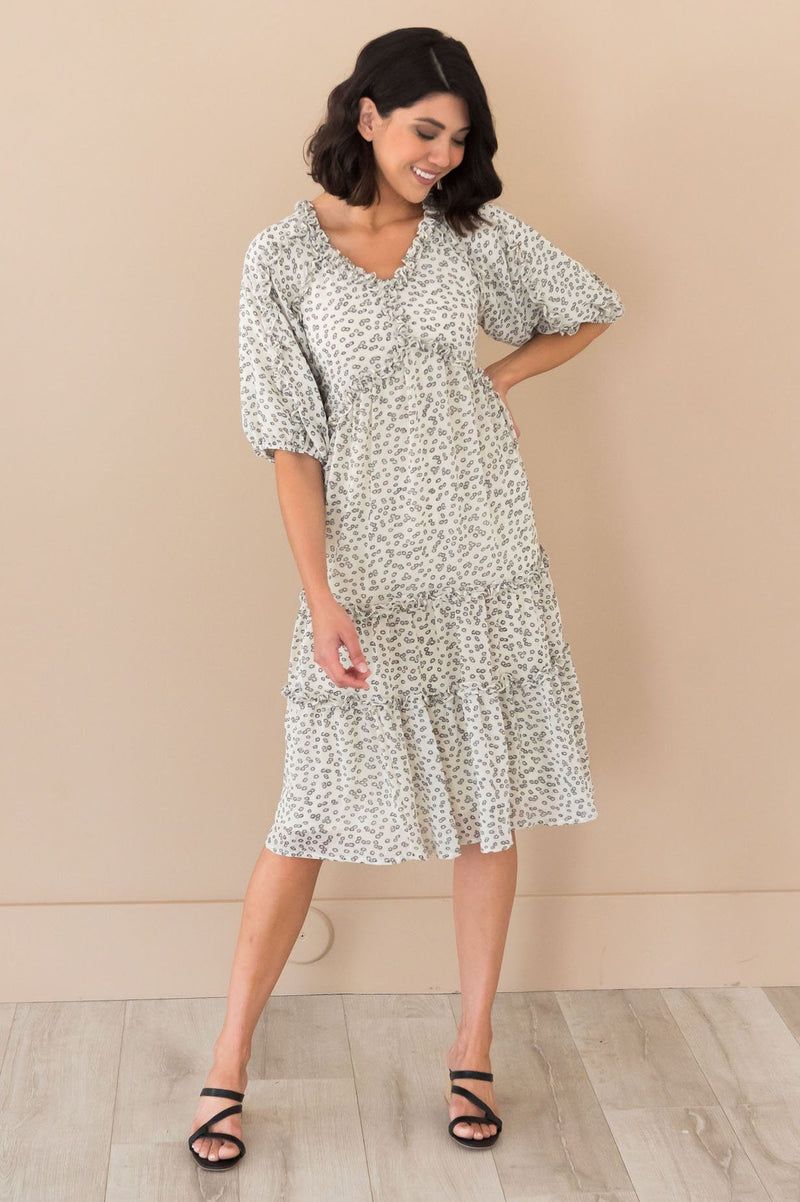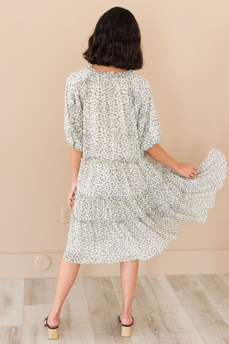 Allow us to introduce you to your new favorite dress, the Anja! This dress is everything you could want in a floral dress and more! Featuring half length sleeves with an elastic hem, ruffled V-neckline, a flowy tiered skirt, black circle floral print, and ruffle detailing throughout. Those amazing features along with the beautiful cream color makes this one a must have for sure!