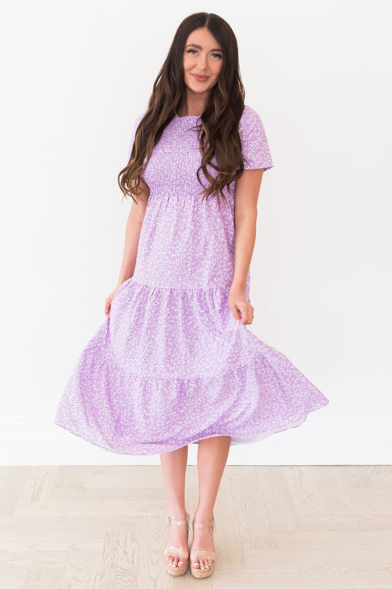 The Annabella is here and we are in love! This beautiful lilac dress has dainty floral print, a tiered skirt, a smocked bodice, and a functional button up back. This dress is a must have for summer!
