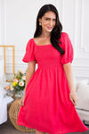 This lovely feminine dress has stolen our hearts and the show as you can easily see! This elegant beauty features a squared neckline with a classy smocked bodice, short puff sleeves, pockets and perfect length skirt. Get yours before these gems are gone!