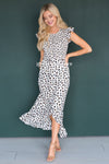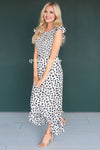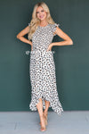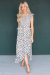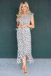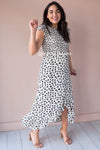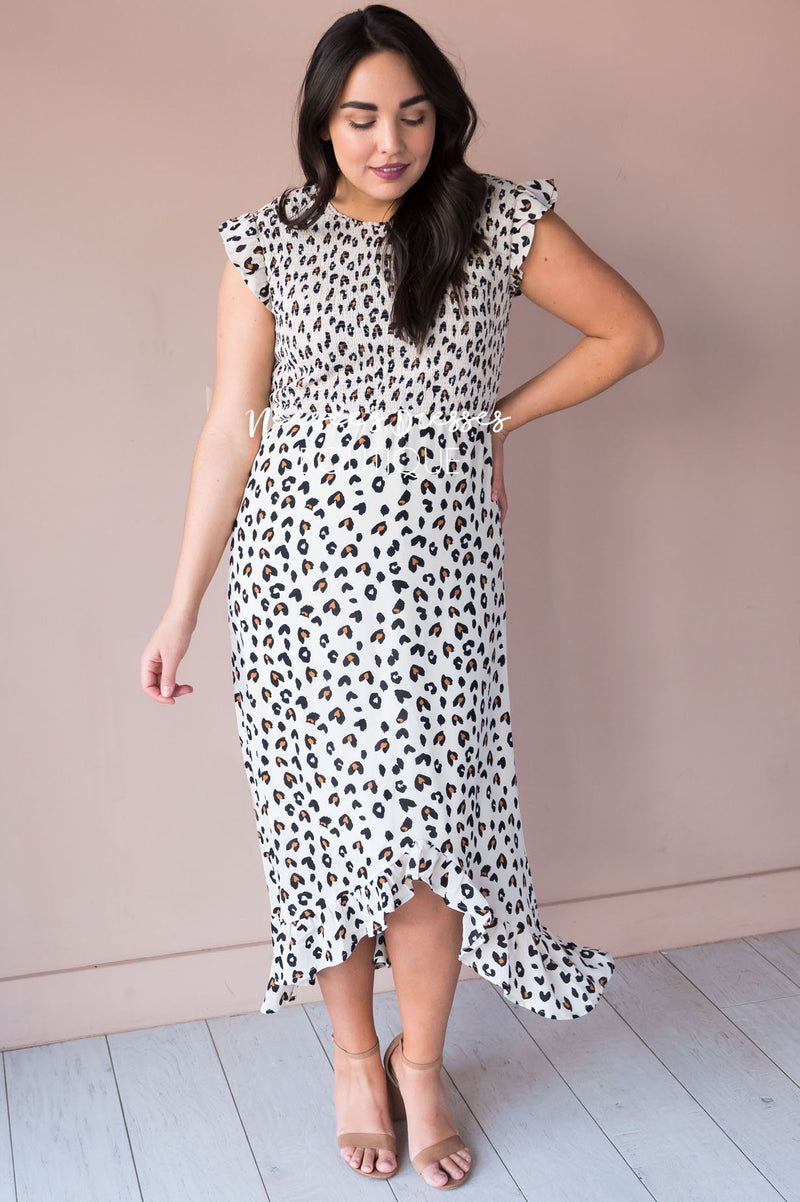 The Annet has got us excited! It truly has all of our favorite modest features in one gorgeous dress! Modest round neckline with a classy shirred bodice, unlined short flutter sleeves, elastic waist, back zipper closure and the most gorgeous flowy ruffle high-low skirt! Not to mention, the classy animal print, this one is a must have!