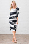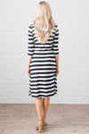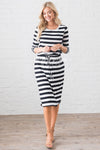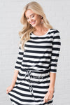 This gorgeous modest dress is so effortlessly cute! Featuring wide stripes, 3/4 length sleeves, an elastic waist with a tie detail and side pockets.
