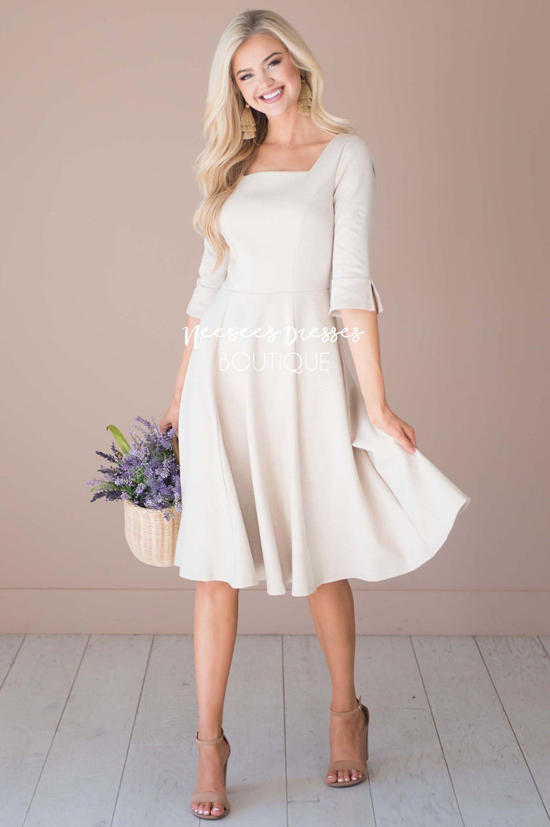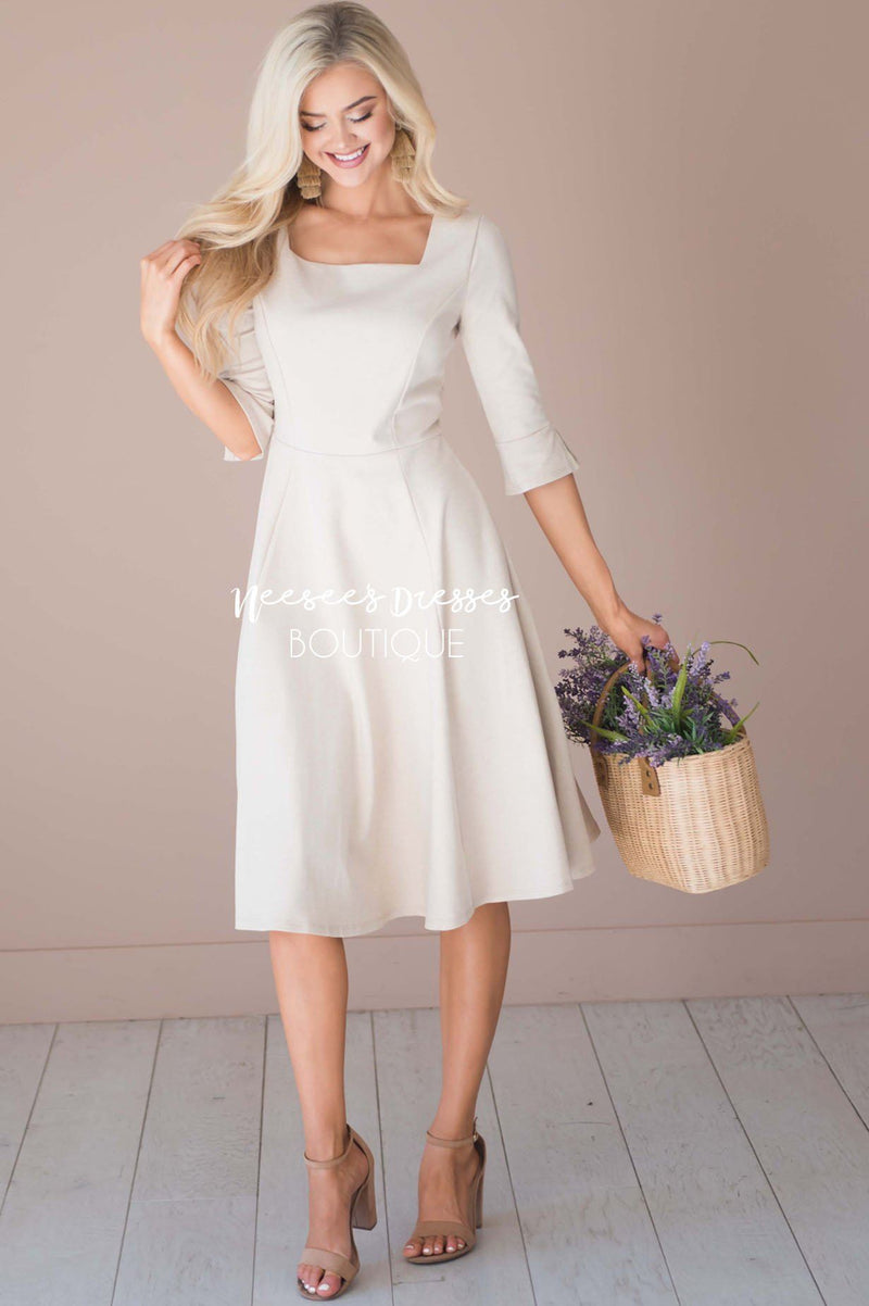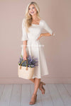 You are going to be in love with the simplicity of this gorgeous dress! There isn't one thing that we don't love about the Annika. This dress features a square neckline and 3/4 length mini bell sleeves. We love a dress with good movement and trust us this one has good movement!