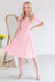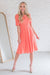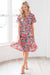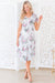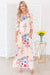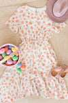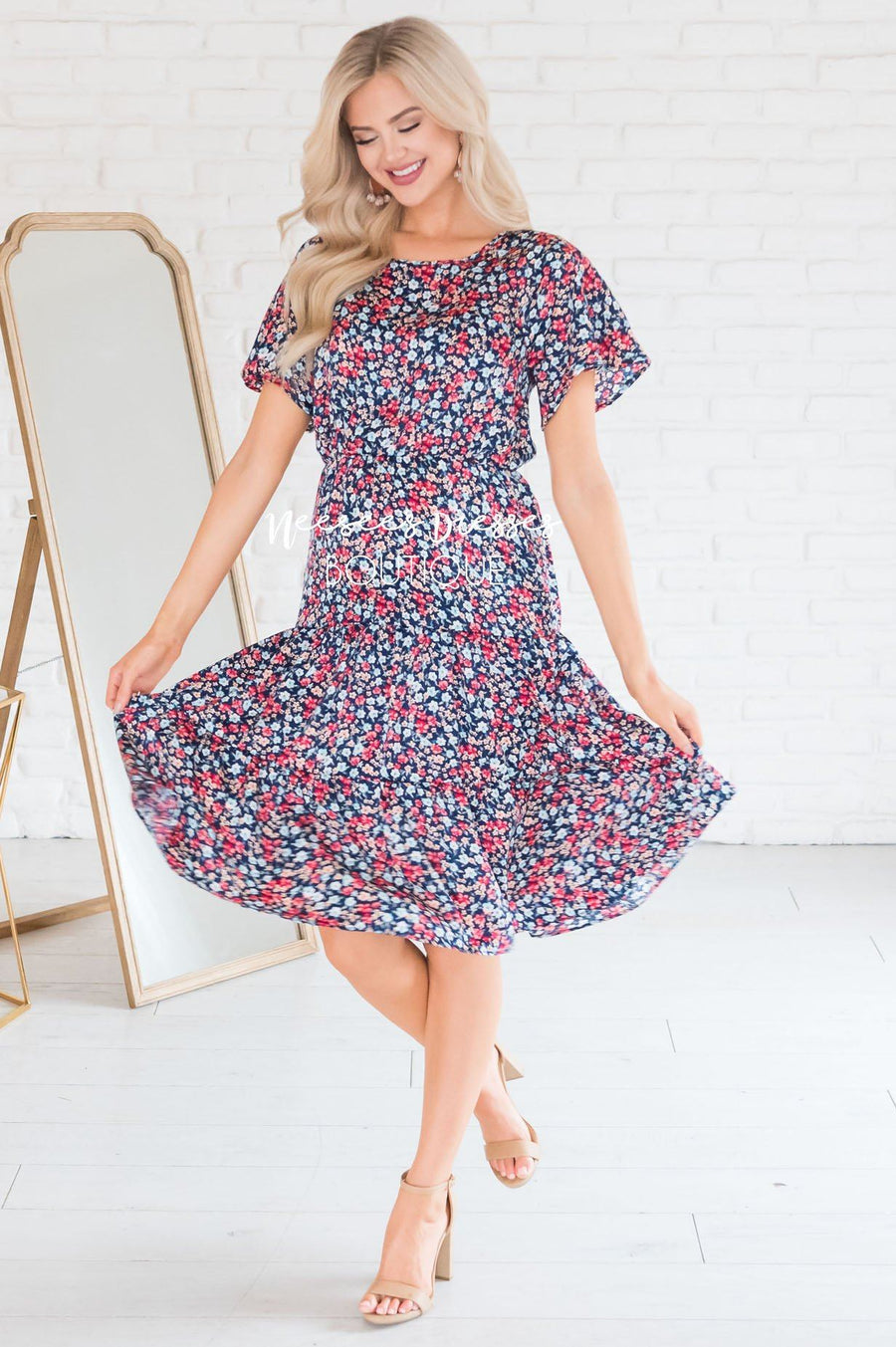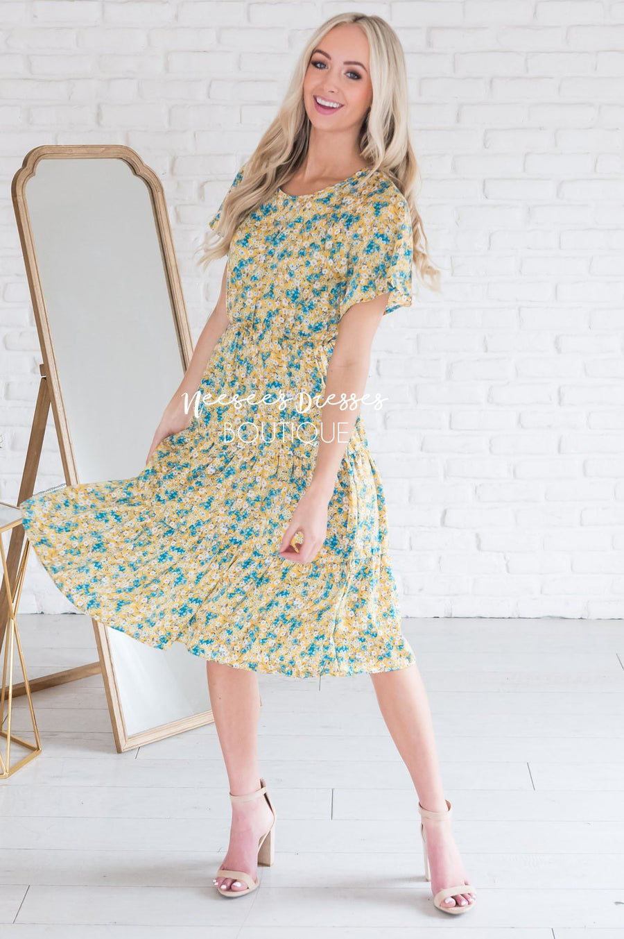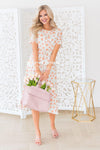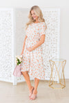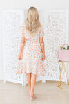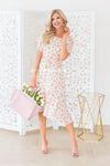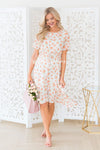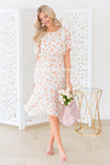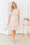 The Anniston has got to be another showstopper! We love the cream with sunset orange & green floral print fabric! Also featuring a classy modest flowy ruffle hemline skirt, round neckline with keyhole button closure, short flutter sleeves and an elastic waist with faux drawstring! This is the perfect dress for a warm spring/summer day!