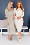 We love modest pencil dresses so much we couldn't resist our new Annita dress. This dresses features include our favorite tea length with lots of stretch throughout, long fitted sleeves, & cozy stylish ribbed material. These are going to go so quick so add yours to your Fall wardrobe today!
